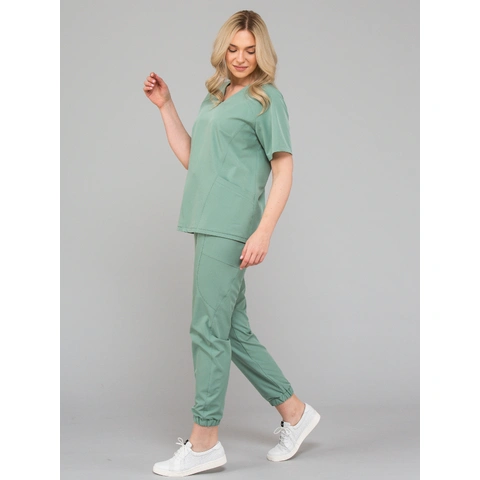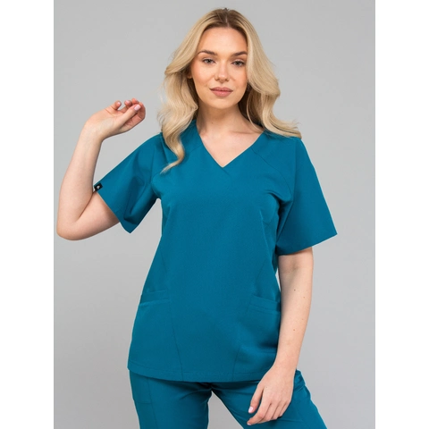 Dametunika med ribbestrikket V-hals og ribbestrikket stretch i sidene.